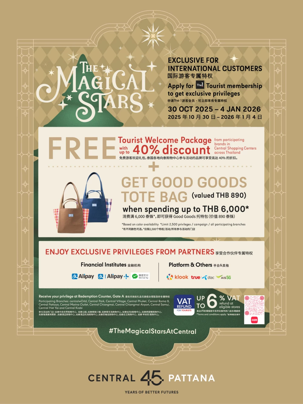 - Free Tourist Welcome Package with up to 40% discount from participating brands in Central Shopping Centers across Thailand